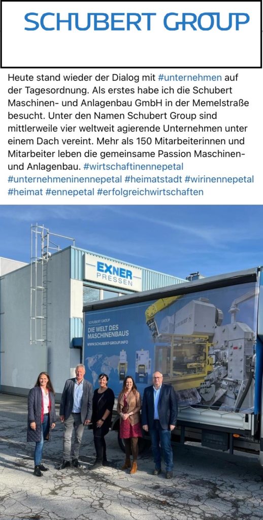 Gestern hatte Schubert Besuch von der Bürgermeisterin, Frau Imke Heymann und Wirschaftsförderin Frau Adriane Overath der Stadt Ennepetal, die sich über die Aktivitäten der SCHUBERT-Group informieren ließen und über aktuelle Themen sprachen. Danke für den Besuch.