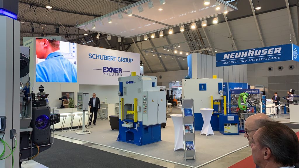Auch die dritte Messe dieses Jahr innerhalb der SCHUBERT GROUP war für EXNER sehr erfolgreich. Wir haben sehr interessante Gespräche mit unseren Kunden führen dürfen. Als Exponate haben wir unsere neue Pressenreihe der Standard Line repräsentiert. Dargestellt wurde auf dem Stand eine hydraulische 40 t-EXNER-Presse, die mit einem 6-achsigen sog. COBOT (kollaboriertender Roboter) ausgerüstet war. Die Aufgabe des Roboters bestand darin, mit seinem integrierten Kamerasystem „Vison-System“ chaotisch liegende Bauteile (Bälle) in einer Kiste zu detektieren, mit dem Robotergreifsystem sicher anzufahren, zu greifen und das Bauteil unter die Presse in ein Werkzeug einzulegen.