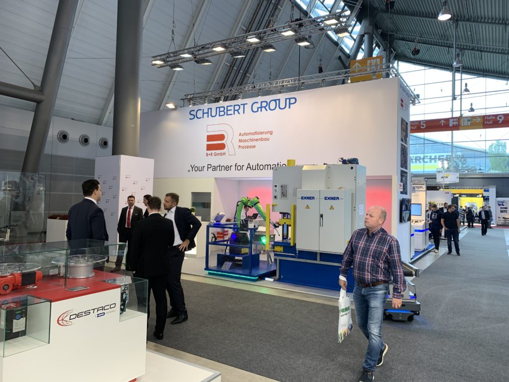 Als erster Messeauftritt unter dem Dach der SCHUBERT GROUP haben wir uns auf der Stuttgarter Automations- und Montagemesse MOTEK Anfang Oktober 2019 präsentiert.Unser Stand war über die Messetage gut frequentiert und es wurden zahlreiche gute Gespräche zum Thema „Prozess- und Bearbeitungsautomation“ mit Bestandskunden aberauch potentiellen Neukunden geführt. Aktuelles Thema auf dem Messestand der B+R GmbH war das Thema „Griff in die Kiste“. Dargestellt wurde auf dem Stand einehydraulische 40 t-EXNER-Presse, die mit einem 6-achsigen sog. COBOT (kollaboriertender Roboter) ausgerüstet war. Die Aufgabe des Roboters bestand darin, mit seinem integrierten Kamerasystem „Vison-System“ chaotisch liegenede Bauteile (Bälle) in einer Kiste zu detektieren, mit dem Robotergreifsystem sicher anzufahren, zu greifen und das Bauteil unter die Presse in ein Werkzeug einzulegen. Nach Verrichtung des Arbeitshubes wurde das Bauteil dem Werkzeug wieder vollautomatisch mit dem Roboter entnommen und zurück in den Behälter gelegt. Vorstellbar ist auch, dass ein Mensch in unmittelbarer Nähe des COBOTS arbeitet, das dieser durch die Integration von Sensoren, bei Kollision, bzw. Berührung mit dem Menschen, stehen bleibt und somit keine Gefahr von dem Roboter für den mitarbeitenden Mitarbeiter besteht. Der vollautomatische Roboter-Pressenaufbau stellte dem Betrachter auf dem Messestand ein vollständig und selbstständig arbeitendes Arbeitssystem von der Bauteilaufnahme, über die Bearbeitung in einem Pressenwerkzeug, bis zum eigenständigen Ablegen in einem Bauteilbehälter, dar. Die hydraulische EXNER-Presse steht symbolhaft für andere Bearbeitungsmaschinen. Genauso denkbar sind jede andere Art von Bearbeitungsmaschinen,die durch einen Roboter bestückt werden. Neben diesem beispielhaften Roboter-Pressenaufbau wurden mit unseren Kunden weitere vielfältige Aufgaben diskutiert, die es im Hause unserer Kunden zu automatisieren gibt. Dabei kamen einfache Handlingsaufgaben im Handhabungsbereich bis zu komplexen Aufgabenstellungen mit mehreren zusammen arbeitenden Robotern zur Sprache.